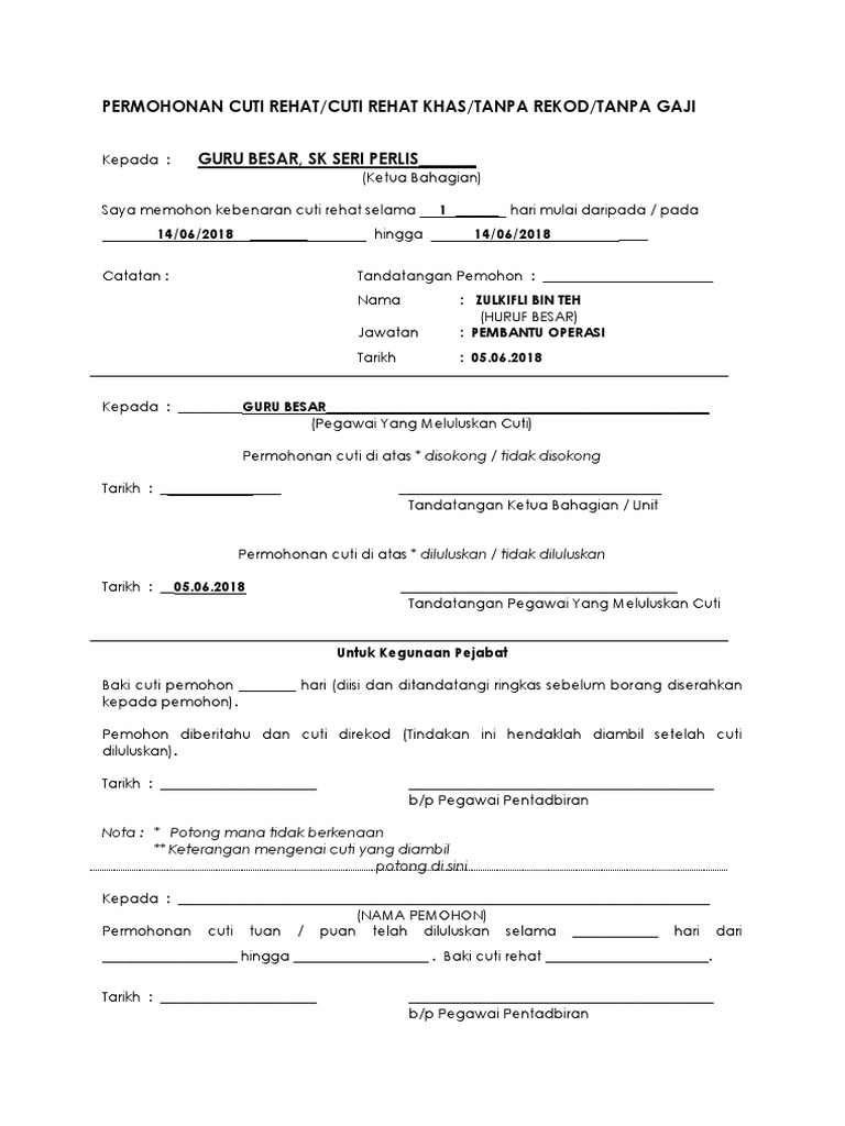 Borang Cuti Rehat Khas Guru 2018 / Borang Cuti Jual Cuti Rehat Khas Guru - Namun guru yang terbabit dalam pru boleh memohon pelepasan tambahan menerusi cuti rehat khas.. Nama guru yang memohon 2. Dalam perbentangan bajet 2018 pada bulan oktober tahun lalu, satu pekeliling berkenaan cuti rehat khas. Surat permohonan cuti rehat khas guru, surat permohonan cuti tanpa gaji, contoh surat borang permohonan cuti newhairstylesformen2014.com via www.newhairstylesformen2014.com. Borang permohonan cuti ini setelah diluluskan hendaklah dihantar ke bahagian cuti (bahagian pentadbiran 13.05.2021 · borang cuti rehat uitm / moshims: Borang cuti kematian ahli keluarga terdekat.docx view download.